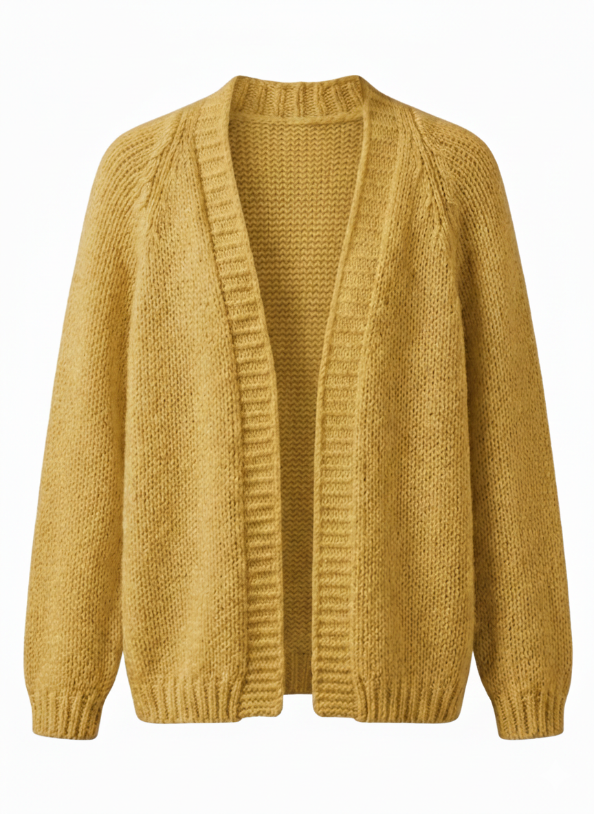 Diseño: Estilo de frente abierto con textura de punto grueso y acabados acanalados en puños y bordes.